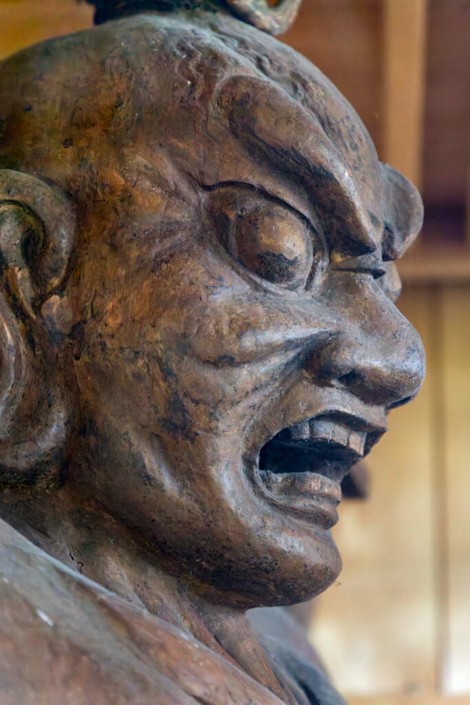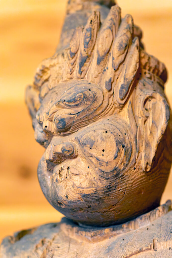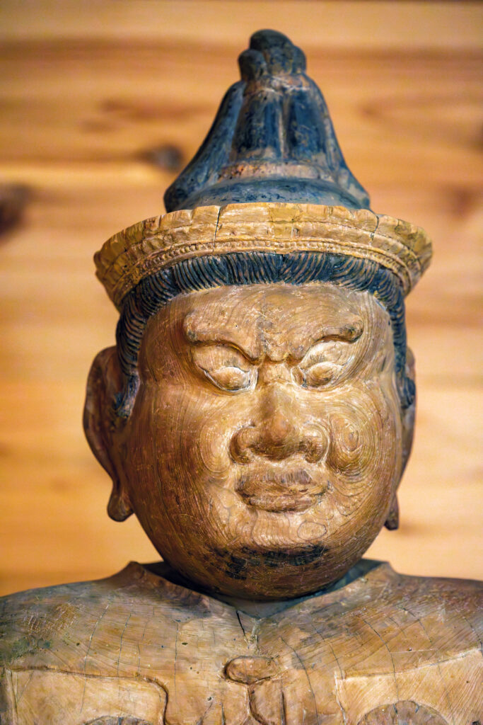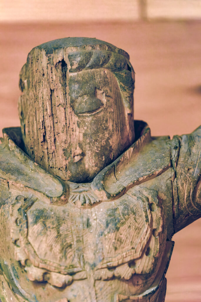 頭の一部が欠けているのか、破損したものを載せているのか、それとも別の像のものを充てているのかわからないが、さらに脚先から邪鬼までも失われており、その部分を木で補うようにして立っている。痛々しくもあるが、木に戻っていくような雰囲気もあって何だか不思議な魅力がある。他の天部立像に比べると、やや造形が違うようにも感じられる。一具ではなく、少し後の像だろうか。
