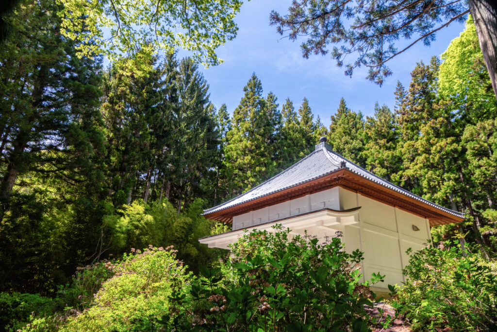 山門をくぐると、深い森の先に赤い銅張り屋根の印象的な建物が見える。
